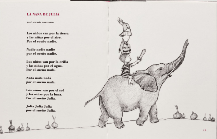 Este “Libro de nanas” es una pequeña joya para madres y cualquier tipo de lector amante de la poesía, desde la selección de textos hasta la excelente ilustración de Noemí Villamuza, además de su diseño y tipografía. Es interesante también cómo se le presenta al lector la ficha biográfica de los autores, de manera lúdica pero también de forma concreta, por ejemplo cuando habla de Gloria Fuertes, dice “se le conoce sobre todo como autora de libros para niños. Sin embargo sus nanas son para todos los públicos. La poeta ha defendido siempre derechos iguales para pequeños y grandes: que la infancia sea obligatoria para todos, y que la hermosura y la juventud se prolonguen hasta el ataúd”. Lo mismo pasa cuando se habla de Lorca, Víctor Jara o Goytisolo.