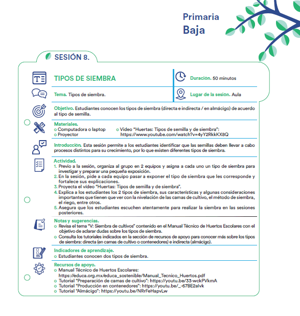 Con el fin de brindar información confiable y los pasos precisos para el desarrollo del proyecto, la fundación ofrece un Manual Técnico de instalación, un Manual de Huertos Escolares para primaria baja y un Manual de Huertos Escolares para primaria alta, estos últimos contienen una serie de fichas con los recursos a utilizar en la sesión, la información general del tema y las actividades a realizar.
