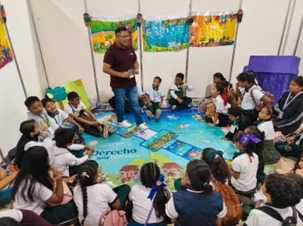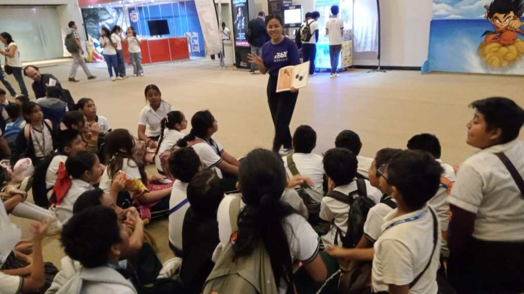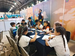 Una vez concluida la charla, cerca de las 11:00 h, las y los estudiantes, los profesores, las madres y padres de familia y los mediadores fueron conducidos al Área de Talleres Infantil y Juvenil (Salón Ek-Balam), en donde las y los estudiantes de segundo y quinto grado tuvieron la oportunidad de participar en diversas actividades, como: “Regalando historias” (Teatro comunitario) impartido el Consejo Nacional de Fomento Educativo (CONAFE); el taller “Educación financiera” impartido por Banamex, en donde aprendieron sobre el hábito del ahorro; y el taller “Alimentación saludable y sostenible” impartido por la organización Nutriixchel y la UNICEF, en donde aprendieron sobre los alimentos y cómo preparar recetas saludables, además de llevarse un nutritivo refrigerio. Asimismo, uno de los grupos de segundo año tuvo la experiencia de conocer el Área de Expositores de libros (Salón Chichén Itzá).