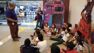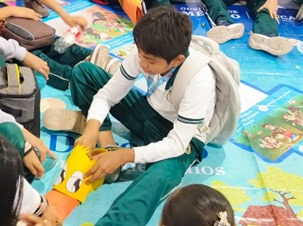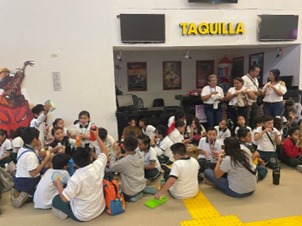 A las 9:05 h, los autobuses arribaron al acceso principal del Centro de Exposiciones en donde las maestras y maestro, las madres y padre de familia, mediadores de IBBY México (quienes forman parte de la célula de acompañamiento de la Fundación Alberto Baillères) y personal de apoyo de la feria acompañaron a las y los estudiantes a la entrada de los Cines Siglo XXI, lugar en donde desayunarían y esperarían el acceso a la actividad programada “Cuentos del bosque”. En ese mismo espacio de tiempo se permitió a las y los mediadores de IBBY realizar, de manera simultánea, tres lecturas en voz alta, una por cada uno de los tres grupos de estudiantes, dos grupos de segundo y uno de quinto (¡Tiemblen dragones!, ¿De quién es esa sombra? e Iguanas ranas).
