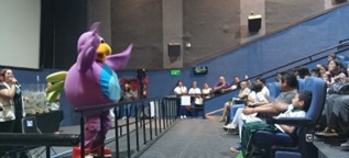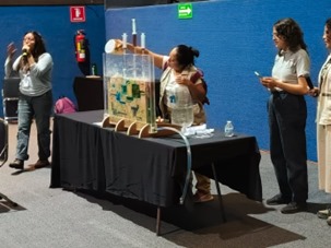 Alrededor de las 10.00 h, el personal de apoyo de la feria junto con los profesores, madres y padres de familia y mediadores tuvieron acceso a la sala de cine en donde se llevaría a cabo la actividad “Cuentos del bosque”. Lamentablemente, ésta tuvo que ser suspendida y en su lugar las y los estudiantes tuvieron la oportunidad de tomar una charla interactiva sobre el suelo kárstico, impartida por el personal de la Reserva Ecológica Cuxtal.